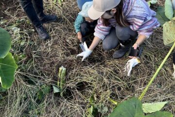 途中で水分塩分補給タイム。スタッフから自家製梅干しを提供。 - 教育農場に戻り、農場の野菜を観察。オクラ、青ナスを収穫。