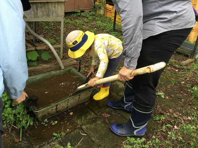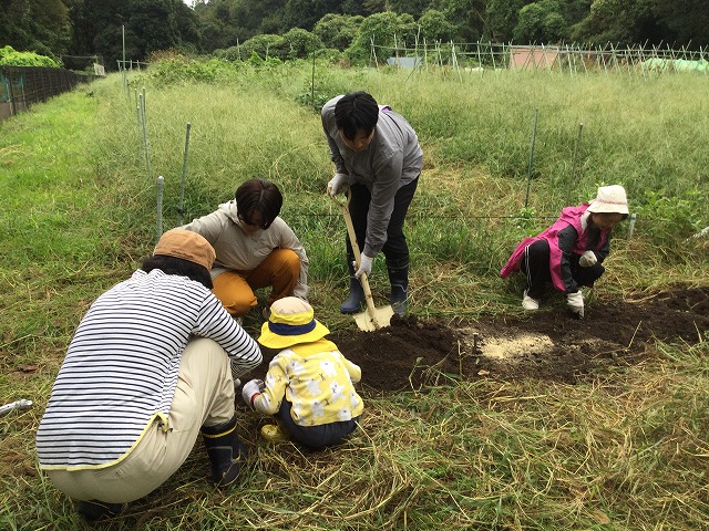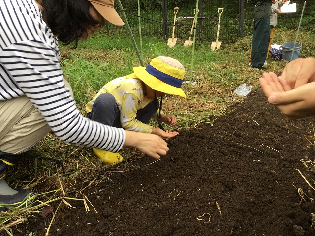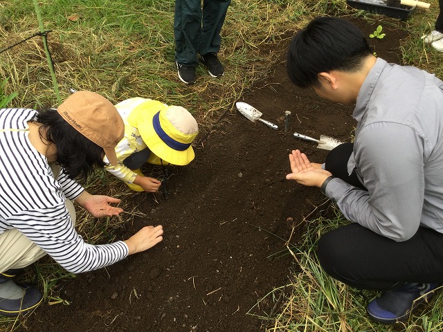 草取り→元肥→耕耘→整地後、タネを播く条をつけ、ハクサイを植える穴を掘る→水やり→植え付け、播種→覆土、鎮圧→綿花の観察→農具片づけ→シソ収穫→集合写真撮影、感想の共有
